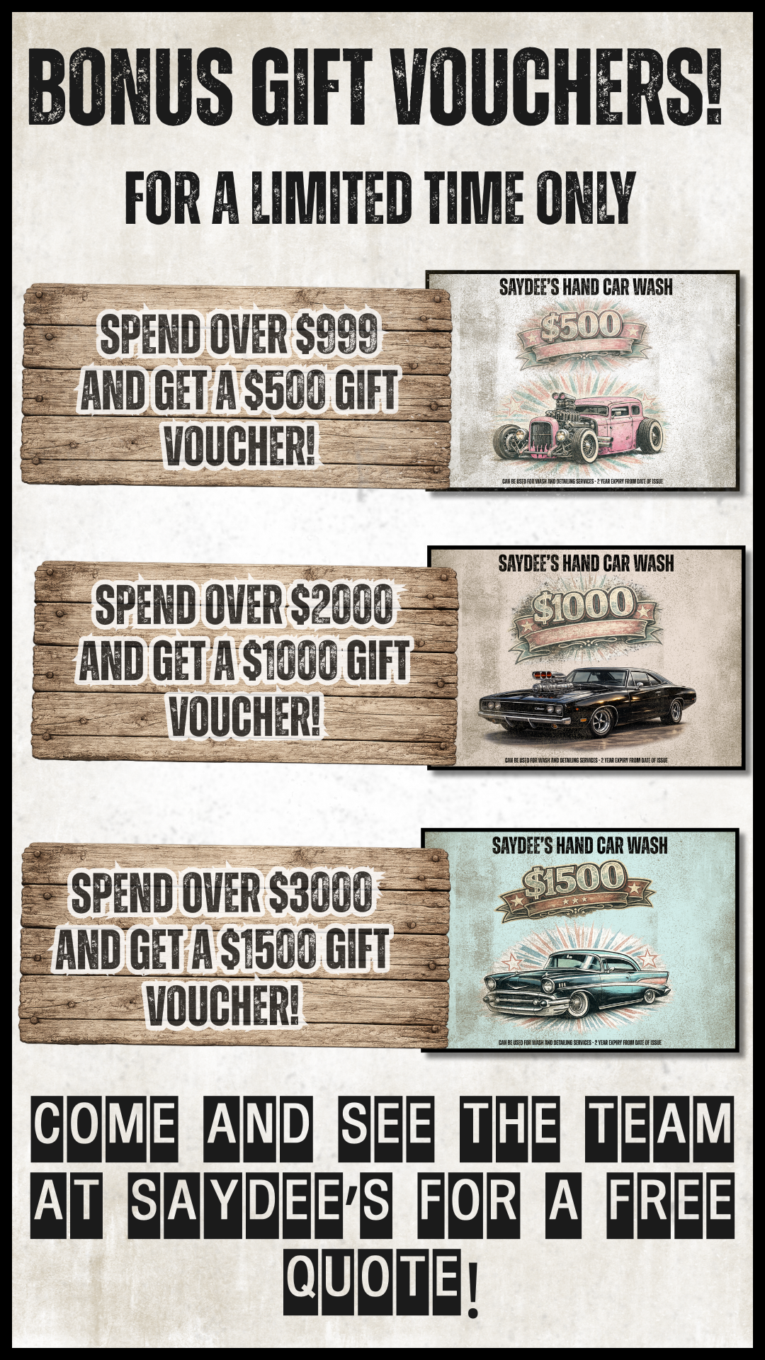 Your car deserves the best, and at Saydee’s, we deliver that with a friendly smile and a touch of 1950s charm. Whether you’re here for a quick wash or a full-on detailing session, we guarantee you’ll leave with a spotless car and a smile on your face!